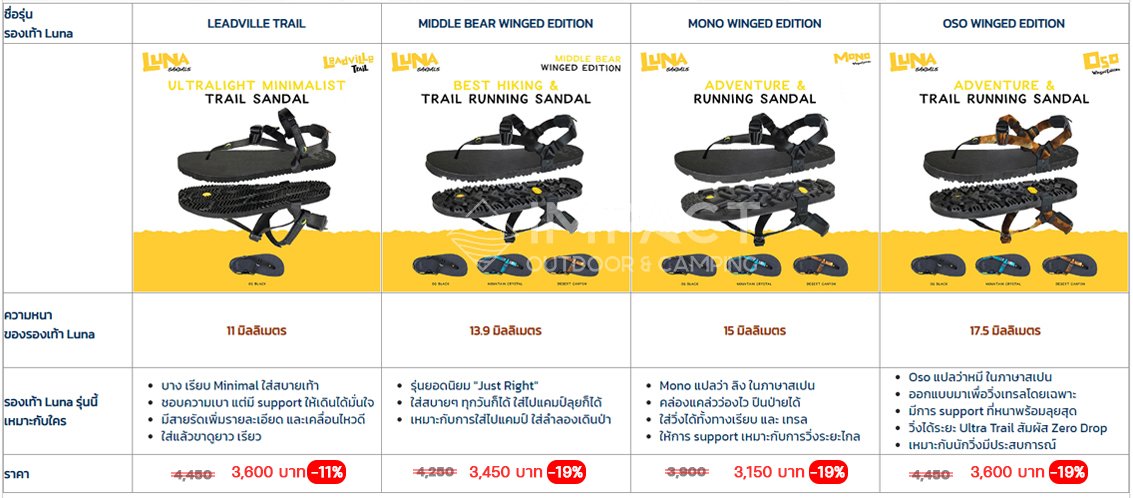 ที่ร้าน อิมแพค เอาท์ดอร์ แอนด์ แคมป์ปิ้ง เมืองทองธานี เรามี รองเท้า Luna Sandals จำหน่ายอยู่ 4 รุ่น คือ LUNA รุ่น LEADVILLE TRAIL, LUNA รุ่น MIDDLE BEAR WINGED EDITION, LUNA รุ่น MONO WINGED EDITION และ LUNA รุ่น OSO WINGED EDITION มากไปกว่านั้นเรายังมี สีให้เลือกสำหรับแต่ละรุ่น คือ สีดำ Black, ฟ้า Mountain Crystal, น้ำตาล Desert Canyon