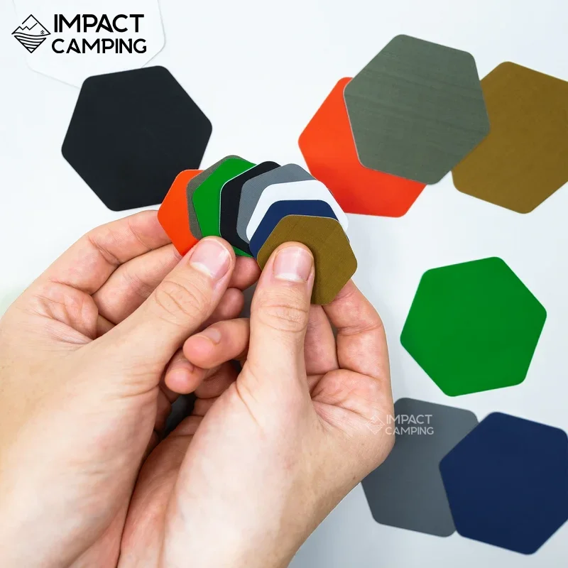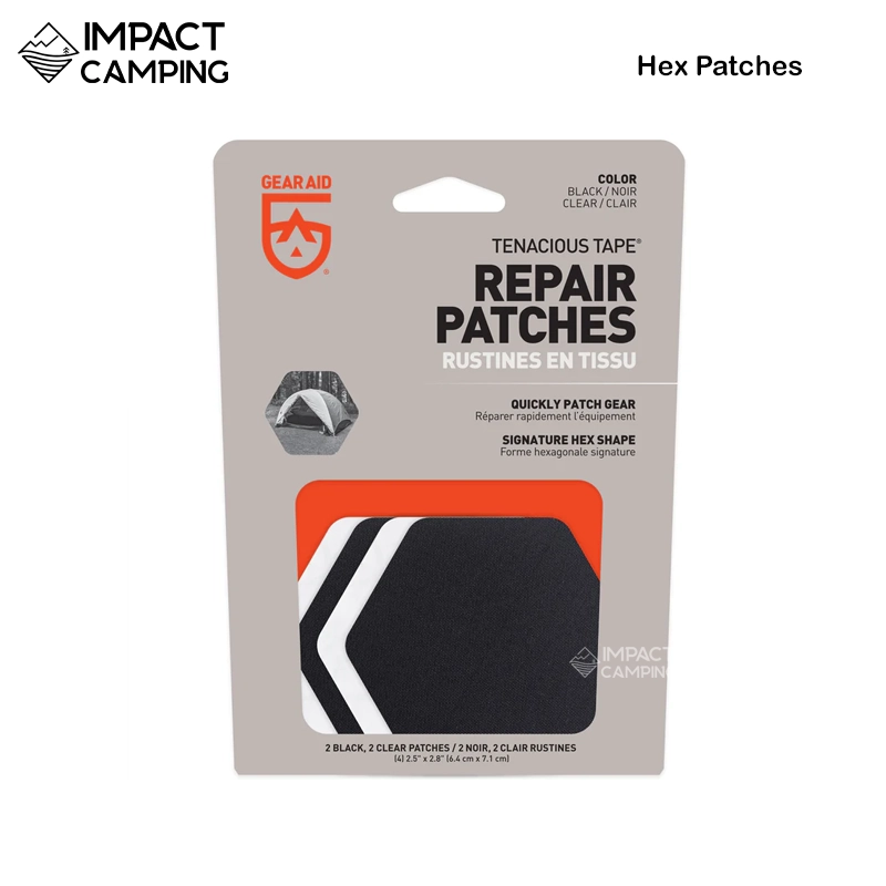 Tape Hex Patches สามารถซ่อมแซมได้อย่างรวดเร็ว ตั้งแต่เสื้อแจ็คเก็ตกันหนาวไปจนถึงเต็นท์ โดยไม่ต้องใช้กรรไกร รูปทรงหกเหลี่ยมที่เป็นเอกลักษณ์เข้ากับตะเข็บ ซิป และช่องต่างๆ ได้ง่าย และเหมาะสำหรับการซ่อมแซมทั้งขนาดเล็กและขนาดใหญ่